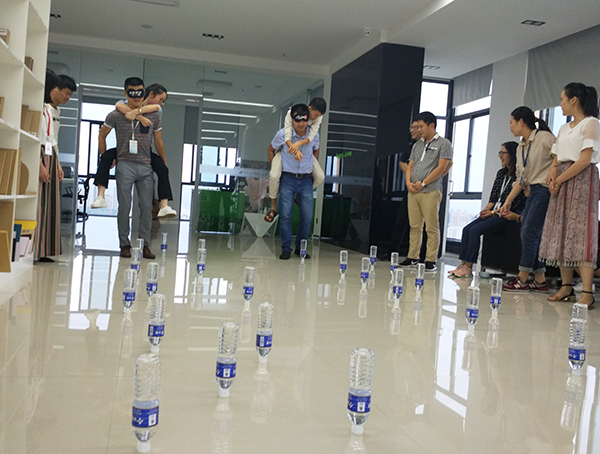 人们常说运动使人快乐,健康使人愉悦!但运动也是对一个人耐力的考验!如果说第一项比赛是开胃菜,那么第二项比赛——“指点迷津”可谓是为各位小伙伴们“大菜”。只见在5平方米的地面组织铺满了20瓶倒立放置的矿泉水,于是小伙伴们称之为“瓶阵”。而小伙伴们要做的就是每队两人一组出赛,一人蒙住眼睛背起另一人并且只能在其的指引下穿越通过瓶阵。如果说第一项比赛比的是每个人的平衡力,那么第二项比赛比的就是体力、耐力,考验的就是小伙伴间的沟通协作了。按常理说,每队都会派出男同胞作为穿越者,毕竟有体力上的优势。但我们的二队有一位不按常理出牌的队长,于是小伙伴们惊讶的发现咱们二队居然派出了一位女将作为穿越者,当然,此女来历不凡,素有“东南女汉子”之称。但毕竟男女体力有差,慢慢的这位女将速度慢了下来,队友们开始紧张起来,加油声此起彼伏,我们看到她脸上豆大的汗珠一颗接着一颗落了下来,我们看到她咬紧牙关向指引着确认着方向,到后来作为竞争者的另一队队员都忍不住为她加油鼓劲!当她踏过终点的那一刻,她笑着瘫坐在地上,而激动的泪水从她的指引者眼中流出。