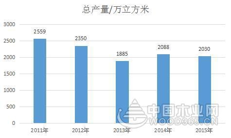 根据国家林业局数据统计,2010年及以前中国刨花板年度产量均在1500万立方米以下。2011年中国刨花板产量剧增,统计数据显示达2559万立方米/年(图1),2011-2015年的5年间,中国刨花板产量在2000万立方米/年左右徘徊。